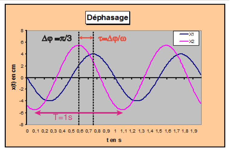 Notion de déphasage: Nous avons vu dans ce qui précède l’importance du terme de déphasage dans l’argument du sinus ou du cosinus lorsque nous avons comparé l’évolution temporelle de l’élongation et de la vitesse par exemple. Nous allons maintenant essayer d’amener cette notion. Lorsque nous comparons deux mouvements périodiques, il est important de savoir s’ils sont indépendants ou non en temps l’un de l’autre. Pour cela, nous allons dans un premier temps introduire la notion de synchronisme. Deux mouvements périodiques ayant la même période sont dits isochrones. S’ils se produisent en même temps, ils sont alors dits synchrones sinon ils sont asynchrones.