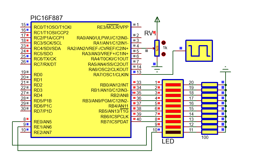 Nous avons utiliser une boucle infinie while() afin de lire et afficher la valeur analogique dans les ports B et C branchés aves les 10 LEDs. Ci-dessous le programme MikroC et le schéma ISIS de câblage. L’allumage des LED est directement lié avec le pourcentage du curseur du potentiomètre RV1.