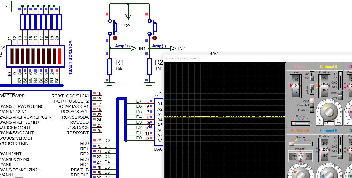 • Le convertisseur A/N: Un mot de 8 bits est envoyé au convertisseur A/N en permanent. Le convertisseur permet de convertir la valeur numérique en un signal analogique.  Voir le projet source de tension pour plus de détails.