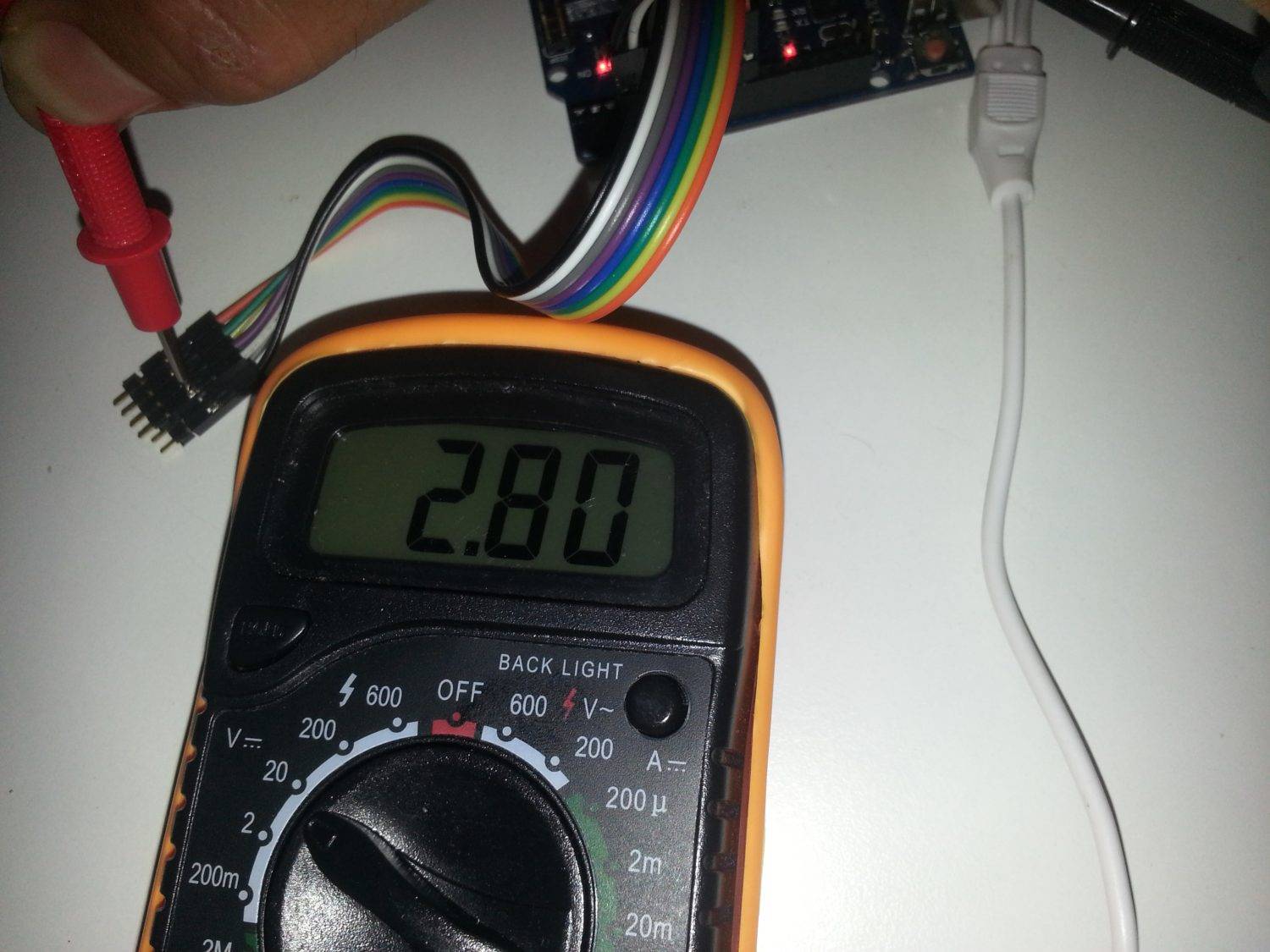 Ou bien alimenter le Kit Arduino avec une alimentation externe de 3.3V dans la broche 3.3V. Danc ce projet l’adaptation se fait par une alimentation externe de 3.5V (voir le photo ci-desous), le niveau logique correspond est de 2.8V dans les pins de l’Arduino qui seront reliés avec la carte FPGA.